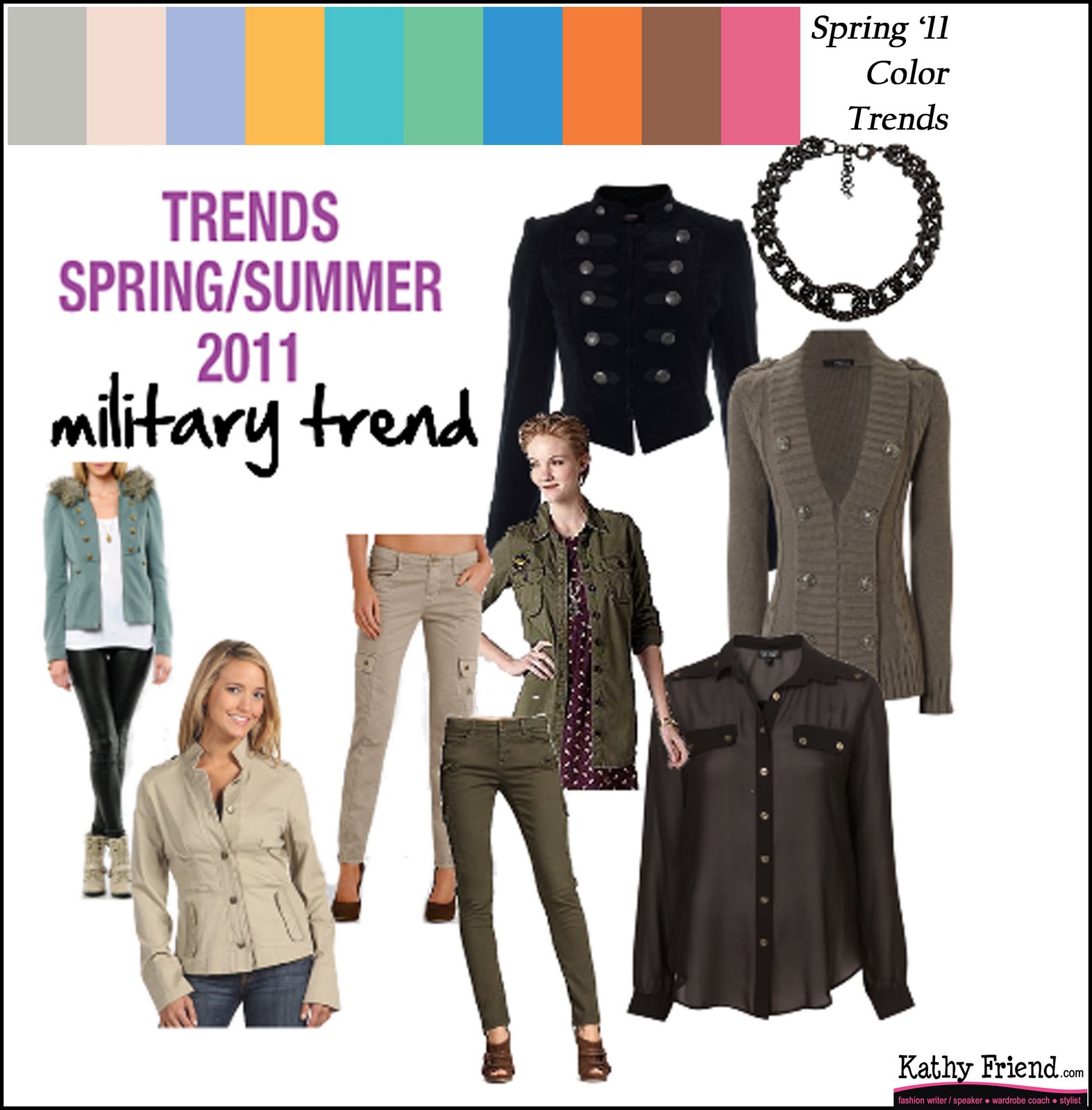 We are seeing this influence everywhere from color to embellishment and style. The khaki-green color we are seeing is attributed to the military trend. To add a little of this trend into your wardrobe, look for chunky metals in your jewelry, or for button detail on shirts / jacket, especially epaulettes.