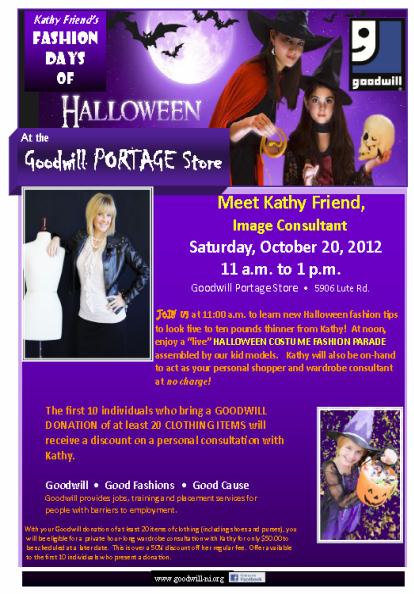 Fashion Day Event – October, Portage, IN Posted on October 2, 2012 by We are on the road again with the hottest ticket around…Fashion Day at Goodwill! In October, we will be in Portage, IN – LIVE with a kids fashion show, mini StyleU workshop given by our resident fashion guru Kathy Friend, AND MUCH MORE!