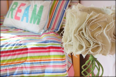 Stencils are all the rage in home decor whether it is a stenciled accent to a wall, to stenciled window treatments, to stenciled accessories in your room. You can find beautiful stencils to choose from at your local hardware store in the paint aisle or you can create your own if you have a craft cutter, like a Cricut or Silhouette. This stencil adds texture to the fabric, thanks to the Tulip Soft Fabric paint. I love the fun bow and cute additions made to this lamp from a scrap of burlap and fabric. I am sure you will love this one too! (@ Tatertots & Jello)