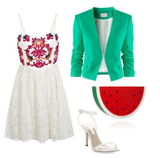 Summer dresses, LOVE THEM!  But I don’t like to wear them to dinner because they are sleeveless, and restaurants are freezing!  Throwing on this green jacket against the white/red sundress is a fun color combination that screams high fashion.  Then, I found a whimsical straw watermelon clutch that really brings the whole look together. FUN!