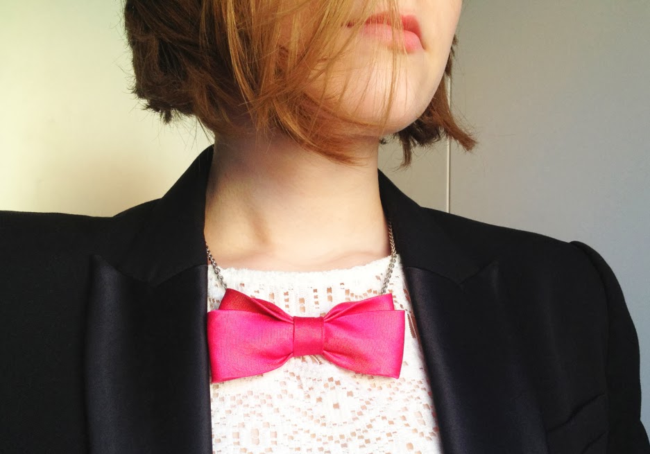 I am a total girly-girl so I am absolutely dying over this adorable Valentine’s Day bow tie on Plan B. You only need a few craft supplies and a men’s necktie to create this look. If a pink tie hasn’t been donated to the store, look for a red tie or anything in those festive red & pink colors. Pair this with a lacy blouse and your best boyfriend blazer for a cute night on the town.
