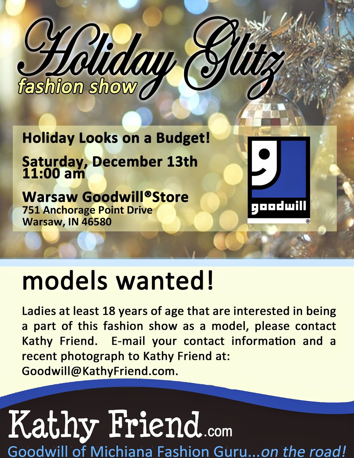 We would love to have you join us for a HOLIDAY GLITZ Fashion Show at the Warsaw Goodwill Store. Our fashion Guru, Kathy Friend will show you some creative ways to use Goodwill finds to meet all of your wardrobe needs this holiday season.