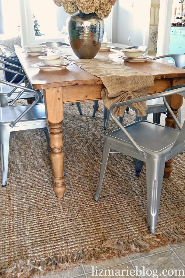 I love burlap projects especially when those projects do not involve sewing. Did you not know that I am a sewing school dropout? I really am! That is why I love this fun table runner from Liz Marie created for burlap. The ruffled detail on the edge adds a feminine touch to your table while still remaining beautifully neutral. What a clever way to disguise a scratched surface without a lot of effort!