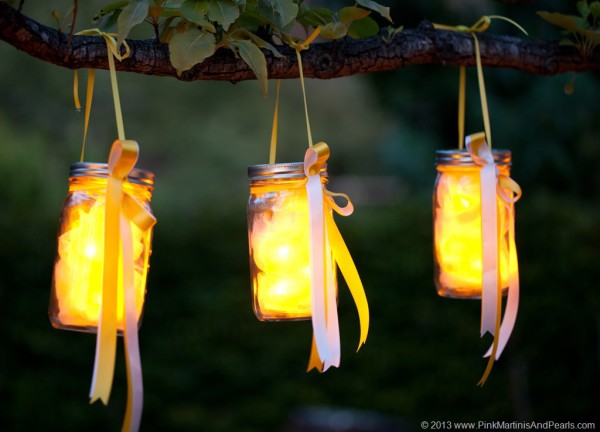 The Tinyprints blog shows you how to make these beautiful outdoor lights with just ribbon, tulle, mason jars (which you find at Goodwill!), and some battery-operated lighting. What a treat for the eyes this would be!