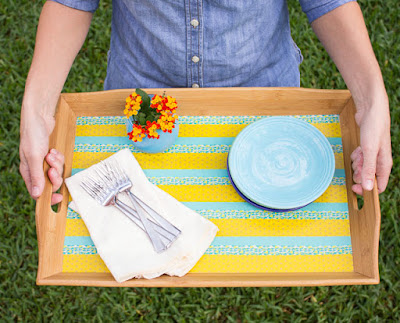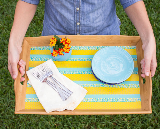 One of the best arsenals in my tools for entertaining outdoors is utilizing serving trays for displaying food and bringing and taking dishes to and from our kitchen in the summer months. If you find a tray that is lacking that sparkle you want or you want to easily coordinate a tray with your dishes, consider giving it a beautiful update with a little washi tape.