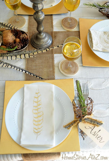 Once again, I am seeing that people are pulling away from the traditional tablecloth and going for the unexpected texture on table. In Home Stories A to Z, she has used a beautiful cabled throw to add warmth and texture to the table. White linens can be stamped with gold (I love my friend Michael’s easy gold foil napkins tutorial for this!)